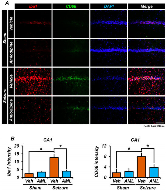 To evaluate the activation of microglia, we conducted staining using ionized calcium-binding adaptor molecule-1 (Iba1) and cluster of differentiation 68 (CD68), which specifically identify microglia and inflammatory microglia, respectively [43,44]. Microglia are the primary immune cells in the brain and play a crucial role in immune and inflammatory responses. However, the excessive activation of microglia after seizures can result in additional harm to neurons. In our study, we measured the intensity of Iba1 staining to assess microglia activation. The results demonstrated that the seizure-vehicle group exhibited approximately three times higher Iba1 intensity than the seizure-amlodipine group. Additionally, we measured the intensity of CD68 staining, to evaluate the presence of inflammatory microglia. The sham groups displayed similar intensities of CD68 staining, while the seizure-vehicle group showed around twice the intensity in comparison with the seizure-amlodipine group (Figure 6A,B).