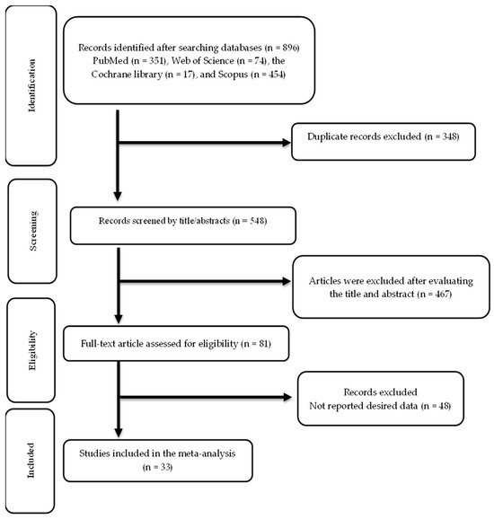 The screening and selection processes for the included trials are illustrated in Figure 1. The first search across multiple databases yielded 896 publications. After eliminating 348 duplicate records, 548 records were reviewed, and 467 were not relevant. The remaining 81 articles were assessed for eligibility, and 33 articles were ultimately included in this meta-analysis [52,53,54,55,56,57,58,59,60,61,62,63,64,65,66,67,68,69,70,71,72,73,74,75,76,77,78,79,80,81,82,83,84].