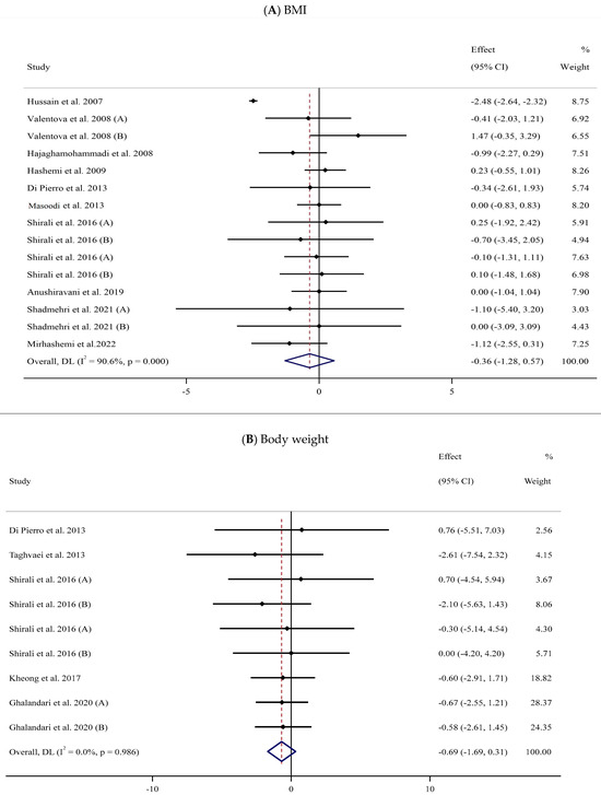 Eleven trials [57,58,60,62,69,72,73,76,79,82,84] with 15 arms and 671 participants (SIL-treated, n = 327; untreated, n = 344) were analyzed to evaluate the impact of SIL supplementation on BMI (Figure 2A). Analysis of the pooled data displayed no considerable differences in BMI between the two groups (WMD: −0.36 kg/m2, 95% CI: −1.28, 0.57; p = 0.447) with substantial heterogeneity (I2 = 90.6%, p < 0.001). The subgroup analysis explored a significant fall in BMI among participants with obesity (Table 2).