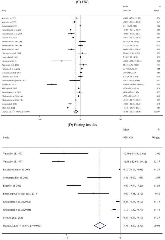 The effect of supplementation with SIL on the concentrations of serum FBG was assessed in 22 trials [52,53,54,55,56,57,58,59,61,62,63,64,65,67,70,71,74,76,77,80,83,84] that involved 1445 participants (719 cases versus 726 controls). The pooled results indicated that SIL effectively decreased serum FBG values in the SIL-treated groups (n = 719) compared to their untreated counterparts (n = 726) (WMD: −21.68 mg/dL, 95% CI: −31.37, −11.99; p < 0.001) with remarkable between-trial heterogeneity (I2 = 99.5%, p < 0.001) (Figure 2C). Subgroup analyses revealed a considerable decrease in serum levels of FBG in the SIL group in comparison to the untreated group in studies involving unhealthy individuals with obesity and baseline serum FBG levels > 126 mg/dL. This reduction was observed in long- and short-term supplementation (<12 and ≥12 weeks) with high or low doses of SIL (≥400 or <400 mg/day) (Table 2).