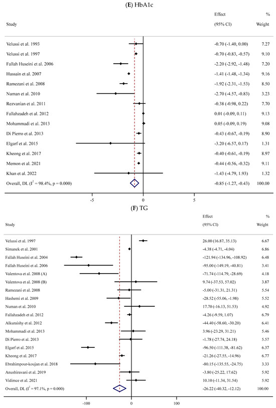 The meta-analysis of 17 RCTs [53,54,55,56,58,59,62,63,65,66,67,71,74,75,76,78,84] with 953 participants (480 cases and 490 controls) indicated a substantial reduction in serum TG levels in the SIL group in comparison with the controls (WMD: −26.22 mg/dL, 95% CI: −40.32, −12.12; p < 0.001). Furthermore, there was considerable heterogeneity among trials (I2 = 97.1%, p < 0.001) (Figure 2F). Similar findings were detected in subgroup analyses among unhealthy participants with normal BMI or obesity and baseline serum TG levels >150 mg/dL after long-term supplementation with high doses of SIL (Table 2).