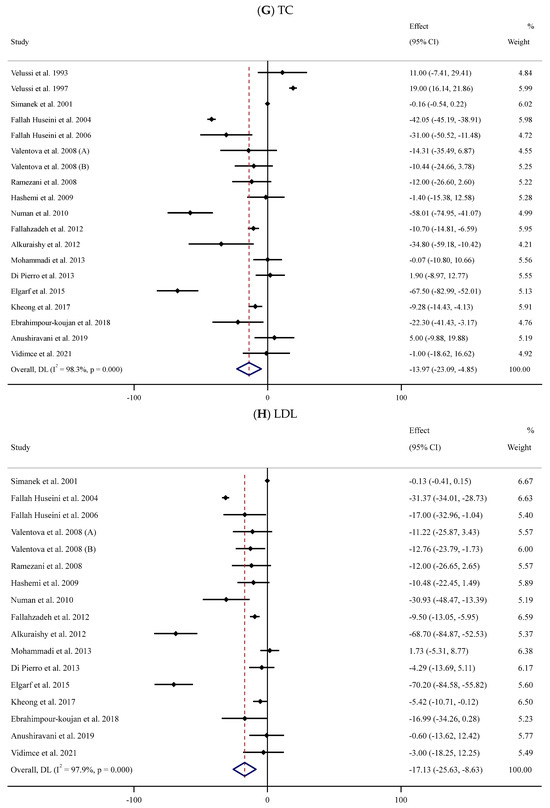 Eighteen trials [52,53,54,55,56,58,59,62,63,65,66,67,71,74,75,76,78,84] with 1013 participants (SIL group vs. controls) explored the impact of SIL administration on serum TC levels (Figure 2G). Pooled analysis showed that SIL consumption caused a significant decline in serum TC levels (WMD: −13.97 mg/dL, 95% CI: −23.09, −4.85; p = 0.003) with substantial between-trial heterogeneity (I2 = 98.3%, p < 0.001). Subgroup analyses indicated a notable reduction in serum TC concentration among unhealthy participants with obesity and baseline serum TC levels >200 or <200 mg/dL after short-term supplementation with high doses of SIL (Table 2).