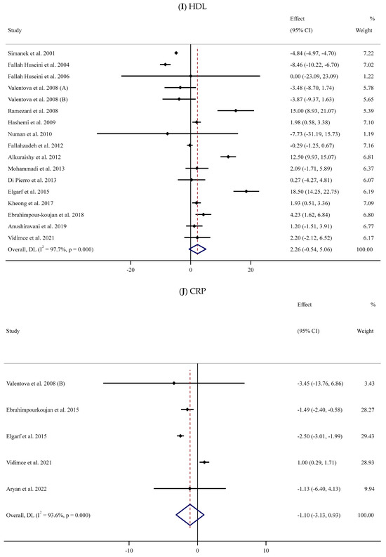 Sixteen trials [54,55,56,58,59,62,63,65,66,67,71,74,75,76,78,84] were conducted to assess the impact of SIL on serum HDL levels among 893 participants. The meta-analysis revealed that there was no substantial impact of SIL on the HDL level in the SIL-treated group when compared to the control group (WMD: 2.26 mg/dL, 95% CI: −0.54, 5.06; p = 0.114). Considerable heterogeneity between studies was also noted (I2 = 97.7%, p < 0.001) (Figure 2I). Subgroup analyses revealed a substantial reduction in serum HDL levels among participants with normal BMI and high or low baseline serum HDL levels after supplementation with low doses of SIL (Table 2).