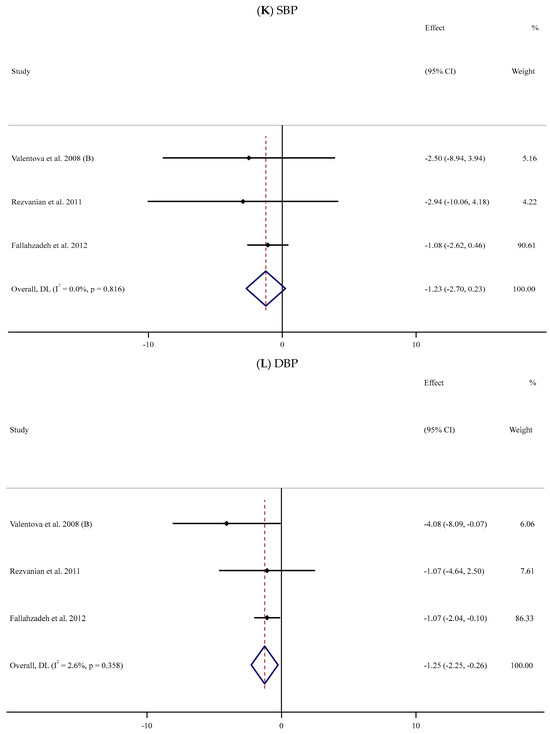 The impact of supplementation with SIL on BP (SBP and DBP) was analyzed in three trials [58,64,65] involving 150 participants (SIL group, n = 78; control group, n = 72) (Table 2). The pooled data revealed no statistically notable differences in SBP values between the two groups (WMD: −1.23 mmHg, 95% CI: −2.70, 0.23; p = 0.099, I2 = 0%) (Figure 2K); however, a significant reduction in the magnitude of DBP was observed among the SIL-treated participants in comparison with the placebo group (WMD: −1.25 mmHg; 95% CI: −2.25, −0.26; p = 0.013, I2 = 2.6%) (Figure 2L).
