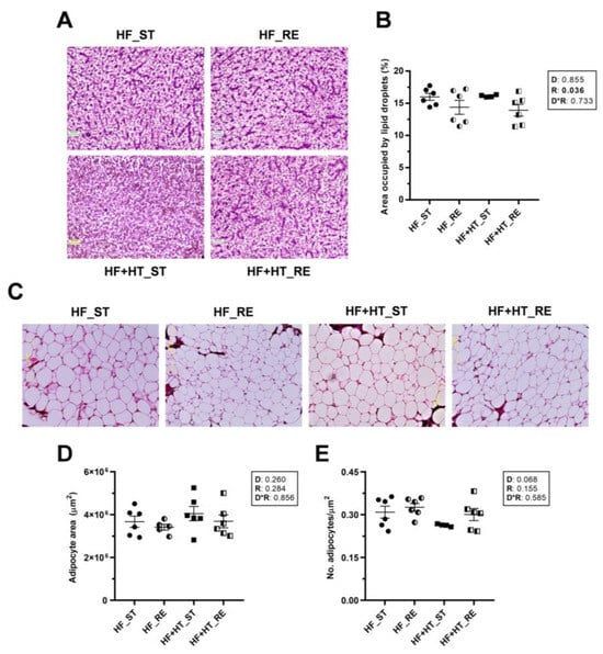 In liver sections, the resulting images and subsequent quantification showed a significant reduction in the percentage area occupied by lipid droplets within the hepatocytes of fish under restricted ration, regardless of the diet (Figure 1A,B). In contrast, adipose tissue slices did not reveal differences in either the area or the number of adipocytes among groups in response to any factor. However, the number of adipocytes in the HF+HT-fed fish at a standard ration was slightly lower than in the other three groups (p-value of diet factor 0.068) (Figure 1C–E).