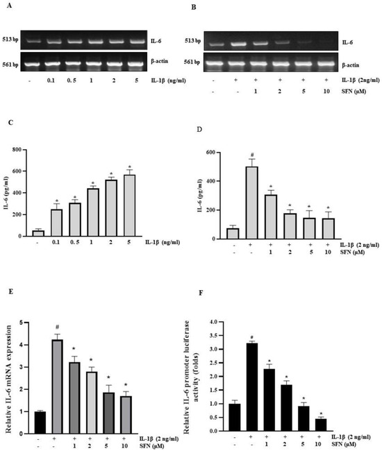 Sulforaphane inhibits IL-1β-induced IL-6 in HT-29 cells. (A) CRC cell line, HT-29 was treated with 0–5 ng/mL IL-1β for 4 h, followed by mRNA extraction and IL-6 expression analysis via RT-PCR. (B) Cells were pre-treated with 1–10 µM sulforaphane for 1 h, then exposed to 2 ng/mL IL-1β for 4 h. IL-6 mRNA levels were assessed by RT-PCR. (C) HT-29 cells were treated with IL-1β (0.1–5 ng/mL) for 24 h after that ELISA was performed to check the secreted IL-6, (D) Cells were pretreated with Sulforaphane (1, 5 and 10 µM) and incubated with 2 ng/mL IL-1β for 24 h, followed by ELISA assay to determined the secreted IL-6 level. (E) RT-qPCR analysis to determine the IL-6 expression level in HT-29 cells pretreated with (1–10 μΜ) Sulforaphane and incubated with 2 ng/mL IL-1β for 4 h. (F) Cells transiently transfected with 1 µg of pGL3-IL-6-promoter reporter construct were pre-treated with sulforaphane for 1 h. After 12-h incubation with 2 ng/mL IL-1β, luciferase activity was measured using a luminometer. Significance markers: # p < 0.05 versus control; * p < 0.05 versus IL-1Β. Data represent mean ± SD from triplicate experiments.