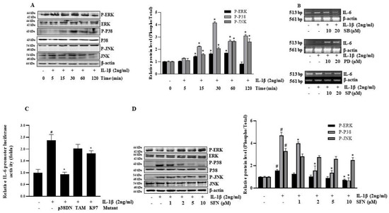 3.3. SFN Suppresses IL-1β-Induced IL-6 by Inhibiting the p38 MAPK Pathway