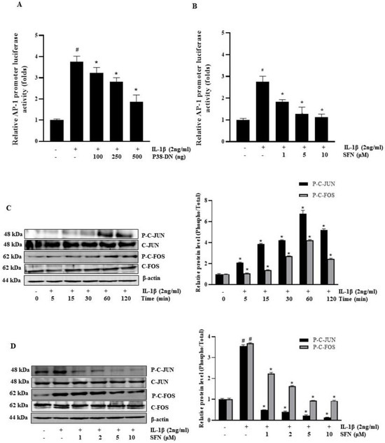 Assessing the presence of IL-1β-responsive cis-regulatory elements in the IL-6 promoter is vital as they influence gene expression by altering transcription factors through signaling molecules. This study revealed that IL-1β enhances AP-1 promoter activity. However, co-transfection with the AP-1 promoter plasmid and the p38-DN plasmid (a dominant-negative mutant of p38 MAPK) significantly inhibited this IL-1β-induced activation of the AP-1 promoter (Figure 4A). Exploring their impact on SFN-mediated suppression of IL-1β expression, we observed that SFN dose-dependently reduced IL-1β-activated AP-1 in AP-1-dependent transcription studies (Figure 4B). Additionally, our results showed that IL-1β raised the levels of phosphorylated c-Fos and c-Jun (components of the AP-1 transcription factor) at different treatment intervals (Figure 4C), both of which were markedly reduced by SFN (Figure 4D).