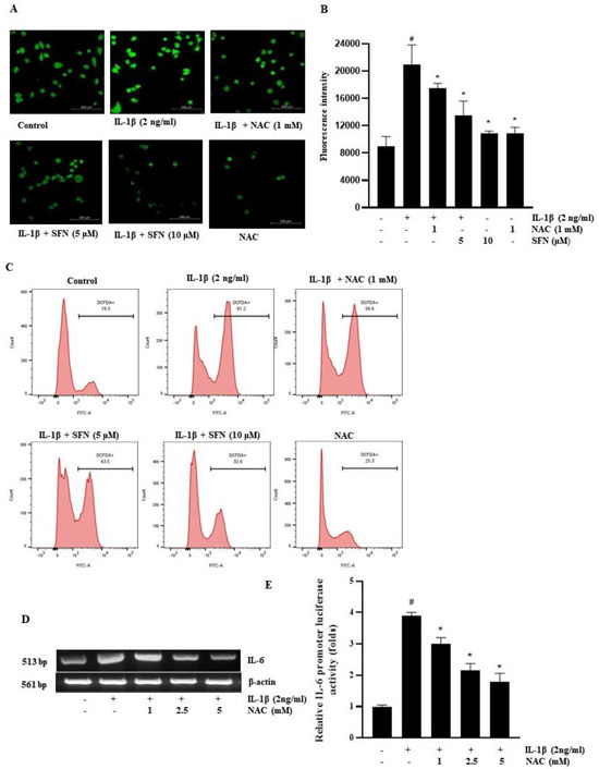 Sulforaphane inhibits the expression of IL-6 in HT-29 cells by inhibiting the production of ROS. (A,B) Confocal microscopy images (200× magnification) showing ROS production and quantitative analysis of ROS levels; scale bar: 100 µM. (C) Flow cytometry was employed to analyze ROS production in HT-29 cells treated with IL-1β (2 ng/mL) and pre-treated with SFN and NAC. (D) Cells pre-treated with 0–5 mM NAC for 1 h and then incubated with 2 ng/mL IL-1β for 4 h were subjected to mRNA extraction and RT-PCR for IL-6 mRNA expression level assessment. (E) Following transient transfection with an IL-6-promoter reporter plasmid, cells were pre-treated with various concentrations of NAC for 1 h and exposed to 2 ng/mL IL-1β for 12 h. Passive lysis buffer was then applied to the lysed cells to determine luciferase activity. Significance markers: # p < 0.05 versus control; * p < 0.05 versus IL-1β. Data represent mean ± SD from triplicate experiments.