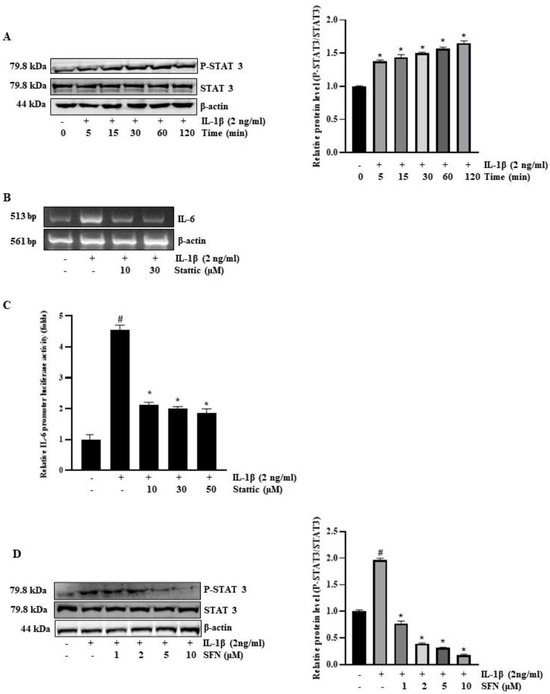 Role of STAT-3 in sulforaphane inhibition of IL-1β-induced IL-6 expression in HT-29 cells. (A) Cells were incubated with 2 ng/mL IL-1β for 0–120 min, followed by Western blot analysis to determine levels of total and phosphorylated STAT-3. (B) Pre-treatment of HT-29 cells with Stattic (10, 30 µM) for 1 h was followed by treatment with IL-1β (2 ng/mL) for 4 h, and IL-6 mRNA levels were then assessed by reverse transcription PCR. (C) Cells transiently transfected with 1 µg of pGL3-IL-6-promoter reporter construct and pre-treated with Stattic for 1 h were exposed to 2 ng/mL IL-1β for 12 h before luciferase activity was measured using a luminometer. (D) Cells pre-treated with sulforaphane for 1 h and then treated with 2 ng/mL IL-1β for 30 min were analyzed for phosphorylated STAT3 levels by Western blot. Significance markers: # p < 0.05 versus control; * p < 0.05 versus IL-1Β. Data represent mean ± SD from triplicate experiments.