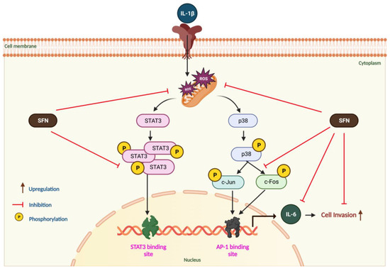 Schematic diagram of SFN-mediated inhibition of IL-1β-induced IL-6 expression in CRC cells. The diagram illustrates the process where IL-1β-induced ROS activates MAPK (p38 and JNK) and STAT3 pathways. This activation leads p38 to stimulate c-Jun, binding to AP-1 and STAT3 binding sites, thereby triggering IL-6 expression and increasing the invasiveness of CRC cells. SFN counters this effect by inhibiting ROS production, thus suppressing IL-1β-induced IL-6 expression.
