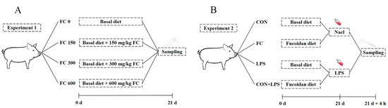 Experiment two: According to the selection protocols of experiment one, this study selected 72 healthy low weight weaned piglets (BW, 6.01 ± 0.32 kg) from 216 healthy weaned piglets (Duroc × Landrace × Yorkshire) with an average body weight (BW, 8.14 ± 0.15 kg) and age (28 ± 1 day). They were randomly allocated into 4 treatments with 6 replicates per treatment and 3 piglets per pen: a basal diet (CON) or 300 mg/kg of fucoidan added to a basal diet (FC) challenged with LPS or not. On day 21, one piglet was selected from each pen. Piglets in the challenged groups were intraperitoneally injected with 1 mL of LPS (Escherichia coli O55:B5, Sigma Chemical, Burlington, MA, USA) at 100 µg/kg BW, and the other piglets were intraperitoneally injected with the same amount of sterile saline (0.9% NaCl). The selection of LPS dosage was based on previous studies on weaned piglets [25]. All the selected piglets were euthanized 4 h later, and plasma and liver samples were collected (Figure 1B).