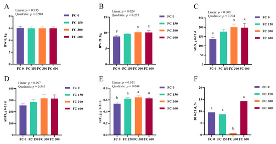 The effects of different doses of fucoidan (FC) supplementation on growth performance and diarrhea incidence of low-weaning weight piglets are presented at 0 to 21 days. (A,B) Body weight of piglets on day 0 (A) and 21 (B). (C–E) Average daily gain (C), average daily feed intake (D), and ratio of average daily gain to average daily feed intake (E) from 0 to 21 days. (F) Diarrhea incidence (DI) from day 0 to 21. Data were expressed as mean with their standard errors represented by vertical bars, (n = 6). Orthogonal polynomials were used to evaluate linear and quadratic responses to the concentrations of FC treatment. FC 0: basal diet, FC 150, FC 300, and FC 600 group, basal diet adding 150, 300, and 600 mg/kg FC, respectively. a,b Means listed in the same row with different superscripts are significantly different (p < 0.05). x,y Means listed in the same row with different superscripts showed a tendency to be different (0.05 ≤ p < 0.10).