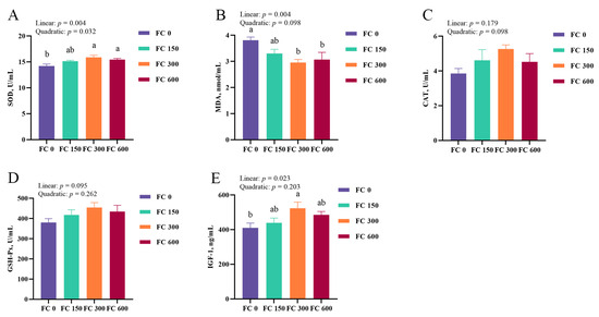 The effects of different doses of FC supplementation on plasma antioxidant enzyme activity and IGF-1 concentrations of low-weaning weight piglets is presented at day 21. (A–D) The plasma concentrations of indicators related to antioxidants (SOD, MDA, CAT, GSH-Px). (E) The plasma concentrations of IGF-1. Data were expressed as mean with their standard errors represented by vertical bars, (n = 6). Orthogonal polynomials were used to evaluate linear and quadratic responses to the concentrations of FC treatment. FC 0: basal diet, FC 150, FC 300, and FC 600 group, basal diet adding 150, 300, and 600 mg/kg FC, respectively. a,b Means listed in the same row with different superscripts are significantly different (p < 0.05).