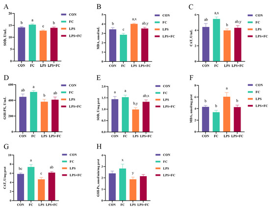 The effects of FC supplementation on the antioxidant enzyme activity of plasma and liver in LPS-challenged low-weaning weight piglets. (A–D) The plasma concentrations of indicators related to antioxidants (SOD, MDA, CAT, GSH-Px). (E–H) The liver concentrations of indicators related to antioxidants (SOD, MDA, CAT, GSH-Px). Data were expressed as mean with their standard errors represented by vertical bars, (n = 6). CON: basal diet, FC: basal diet + 300 mg/kg FC. a–c Means listed in the same row with different superscripts are significantly different (p < 0.05). x,y Means listed in the same row with different superscripts showed a tendency to be different (0.05 ≤ p < 0.10).