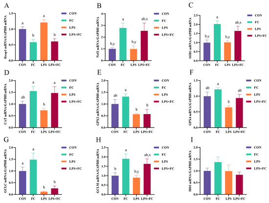 The effect of FC regulation and LPS challenge on liver antioxidant gene mRNA expression in low-weaning weight piglets. (A–I) Relative mRNA expression of Keap1, Nrf2, SOD1, CAT, GPX2, GPX4, GCLC, GCLM, and HO-1. Data were expressed as mean with their standard errors represented by vertical bars, (n = 6). CON: basal diet, FC: basal diet + 300 mg/kg FC. a,b Means listed in the same row with different superscripts are significantly different (p < 0.05). x,y Means listed in the same row with different superscripts showed a tendency to be different (0.05 ≤ p < 0.10).
