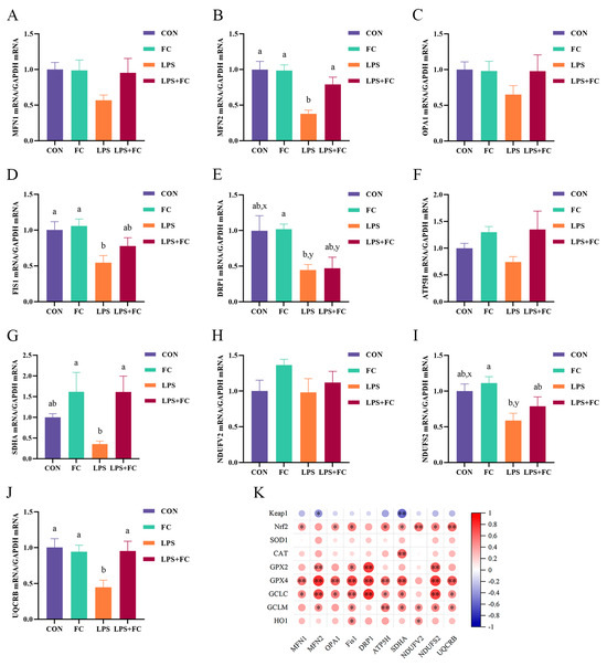 The effect of FC regulation and LPS challenge on liver mitochondrial biogenesis and respiratory chain membrane protein-related gene mRNA expression in low-weaning weight piglets. (A–J) Relative mRNA expression of MFN1, MFN2, OPA1, FIS1, DRP1, ATP5H, SDHA, NDUFV2, NDUFS2, and UQCRB. (K) The heatmap of Spearman’s correlation between the expression of mitochondrial function-related genes and Keap1/Nrf2 signaling pathway genes. Data were expressed as mean with their standard errors represented by vertical bars, (n = 6). CON: basal diet, FC: basal diet + 300 mg/kg FC. a,b Means listed in the same row with different superscripts are significantly different (p < 0.05). x,y Means listed in the same row with different superscripts showed a tendency to be different (0.05 ≤ p < 0.10). * p < 0.05, ** p < 0.01. (A) MFN1 = mitofusin 1, (B) MFN2 = mitofusin 2, (C) OPA1 = optic atrophy 1, (D) FIS1 = mitochondrial fission protein 1, (E) DRP1 = dynamin-related protein 1, (F) ATP5H = ATP synthase, H+ transporting, mitochondrial F0 complex, subunit, (G) SDHA = succinate dehydrogenase complex flavoprotein subunit A, (H) NDUFV2 = NADH ubiquinone oxidoreductase core subunit V2, (I) NDUFS2 = NADH ubiquinone oxidoreductase core subunit S2, and (J) UQCRB = ubiquinol cytochrome c reductase binding protein. (K) Keap1 = kelch-like ECH-associated protein l, Nrf2 = nuclear factor-erythroid 2-related factor 2, SOD1 = superoxide dismutase 1, CAT = catalase, GPX = glutathione peroxidase, GCLC = glutamate-cysteine ligase catalytic subunit, GCLM = glutamate-cysteine ligase modifier subunit, HO1 = heme oxygenase 1.