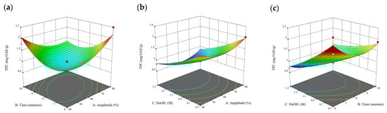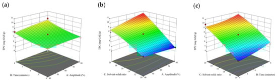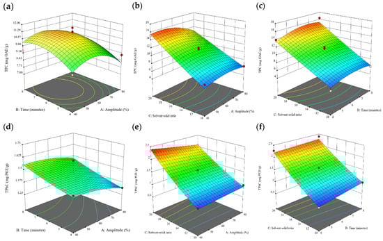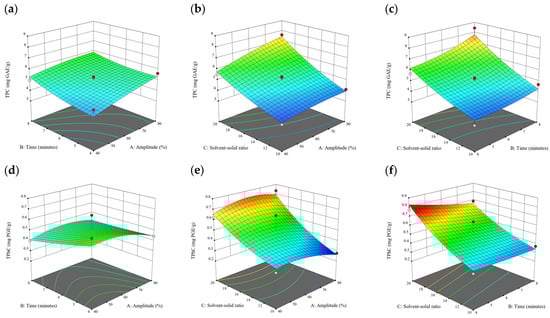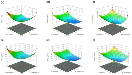 When the extraction time varied from 2 to 8 min, a remarkable increase in the TPC, TPhC, and DPPH activity was observed. Beyond that time range, there was a slight decrease in these properties. Therefore, 4, 6, and 8 min were chosen for the coded extraction time variable levels for free phenolics extraction. Similar preliminary experiments were conducted for bound phenolics. When the extraction time varied from 2 to 10 min, a consistent uptrend of the TPC and TPhC recovery and DPPH activity was noted. Therefore, 6, 8, and 10 min were chosen for the coded extraction time variable levels for bound phenolic extraction.