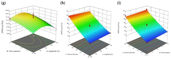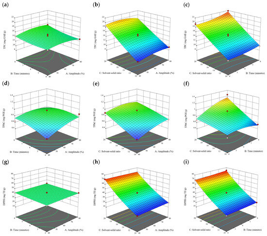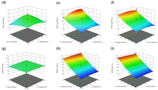 Three-dimensional response surface plots for total polyphenol content (a–c), total phlorotannin content (d–f), and 2,2-diphenyl-1-picrylhydrazyl (DPPH) assay (g–i) of free phenolic extract in D. potatorum.