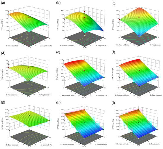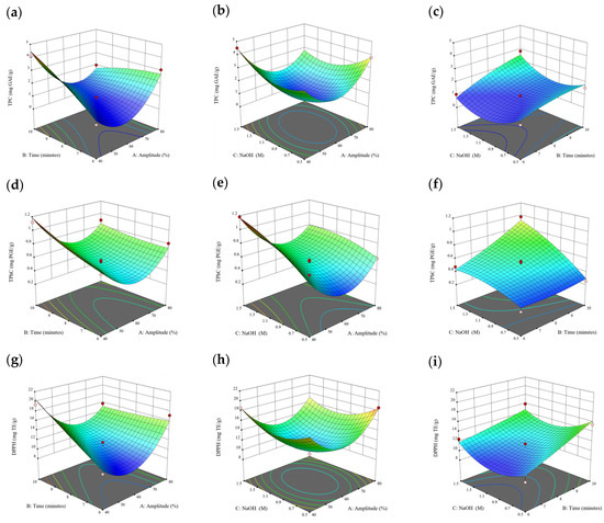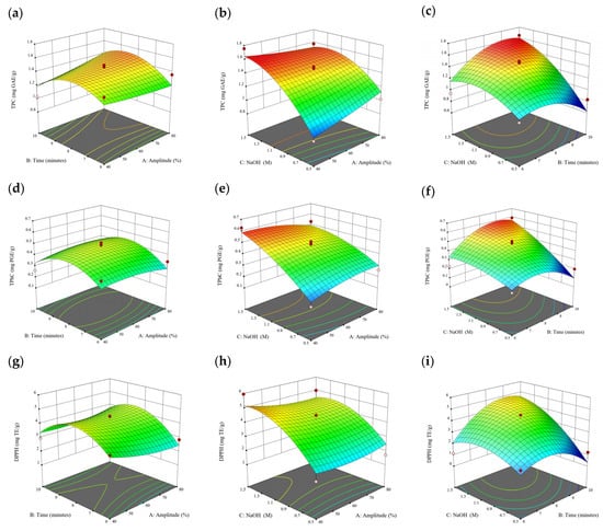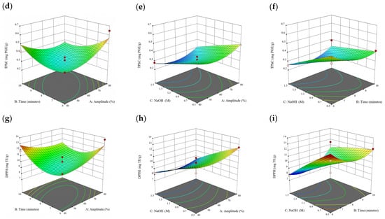 Three-dimensional response surface plots for total polyphenol content (a–c), total phlorotannin content (d–f), and 2,2-diphenyl-1-picrylhydrazyl (DPPH) assay (g–i) of bound phenolic extract in E. radiata.