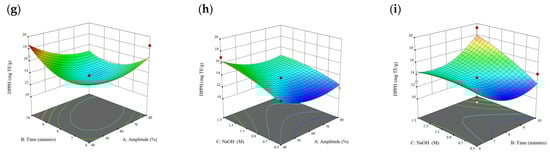 Three-dimensional response surface plots for total polyphenol content (a–c), total phlorotannin content (d–f), and 2,2-diphenyl-1-picrylhydrazyl (DPPH) assay (g–i) of free phenolic extract in P. comosa.