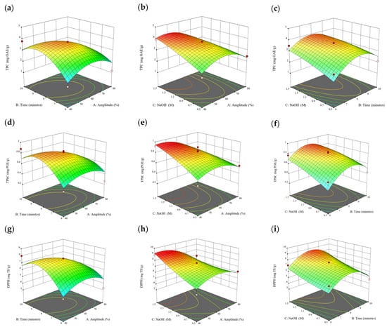 Three-dimensional response surface plots for total polyphenol content (a–c), total phlorotannin content (d–f), and 2,2-diphenyl-1-picrylhydrazyl (DPPH) assay (g–i) of bound phenolic extract in P. comosa.