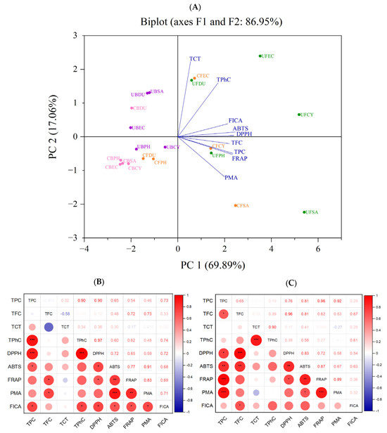 Correlation analysis of antioxidant activity. (A) PCA analysis. (B) Correlation plot of antioxidant activities of free phenolics. (C) Correlation plot of antioxidant activities of bound phenolic extract (* p ≤ 0.05, ** p ≤ 0.01, *** p ≤ 0.001). TFC (total flavonoid content), TPC (total phenolic content), TCT (total condensed tannin), TPhC (total phlorotannin content), ABTS (2,2′-azino-bis(3-ethylbenzothiazoline-6-sulfonic acid), DPPH (2,2-diphenyl-1-picrylhydrazyl), FRAP (ferric-reducing antioxidant power), PRAC (phosphomolybdate-reducing antioxidant capacity), FICA (ferrous ion chelating activity), CF (Conventional Free), UF (Ultrasonication Free), CB (Conventional Bound), UB (Ultrasonication-Bound), CY (Cytospora sp.), DU (Durvillaea potatorum), SA (Sargassum fallax), EC (Ecklonia radiata), PH (Phyllospora comosa).