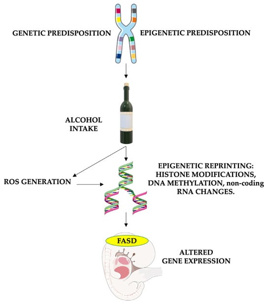 Fetal cellular alterations of epigenetic patterns and susceptibility to reactive oxygen species (ROS) appear to play a major role in causing fetal changes. The molecular bases of FASD involve oxidative stress, characterized by an imbalance between ROS and antioxidant defense systems induced by alcohol metabolism. This oxidative stress leads to cellular damage, particularly in the vulnerable fetal brain, resulting in disruptions in development. Moreover, oxidative stress is implicated in epigenetic changes, including alterations in DNA methylation, histone modifications, and microRNA expression, influencing gene regulation in individuals with FASD [64,69].