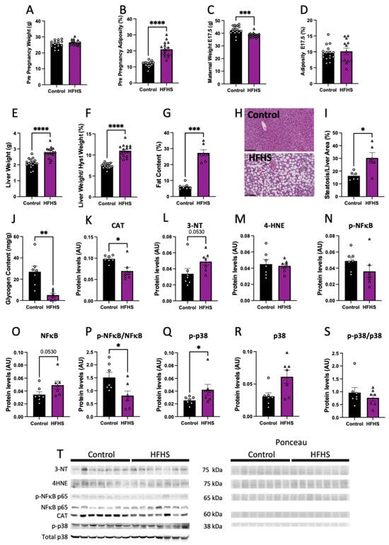 Maternal body composition and liver damage. Maternal pre-pregnancy weight (A); and adiposity (B). Maternal weight (C); and adiposity at E17.5 (D). Liver weight (E); liver to hysterectomy weight (F); percentage of fat content (G); representative picture of liver structure (H; 20× magnification; black scale bar = 100 µm); steatosis to liver area (I); and liver glycogen content (J). Maternal liver protein levels of catalase (CAT, K); 3-nitrotyrosine (3-NT, L); 4-Hydroxynonenal (4-HNE, M); phosphorylated p65-NFκB (N); total levels of p65-NFκB (O); phosphorylated to total p65-NFκB (P); phosphorylated p38 (Q); total p38 (R); phosphorylated to total p38 (S); and representative image of Western blots (T). Groups are controlled (Control, black bars, circles, n = 17 from A–F; n = 7 from G–T) and high-fat high-sugar diet (HFHS, magenta bars, triangles, n = 16 from A–F; n = 7 from G–T). Each dot represents one individual. Mean ± SEM is shown. The ROUT test was applied to identify outliers and Shapiro–Wilk was used to determine the normality of data. Data were submitted to the Student’s t-test or Mann–Whitney according to data distribution. * p ≤ 0.05; ** p < 0.005; *** p < 0.0005; **** p < 0.0001.