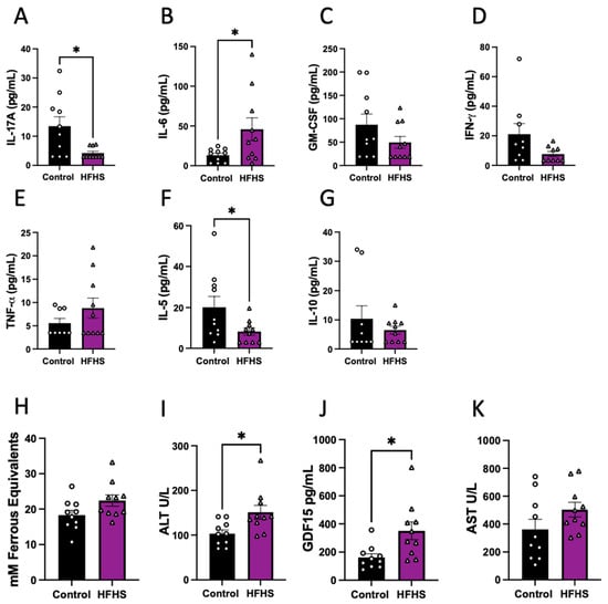 Cytokines, oxidative stress, and liver damage markers in maternal plasma. Maternal plasma levels of IL-17 (A); IL-6 (B); GM-CSF (C); IFN-γ (D); TNF-α (E); IL-5 (F); and IL-10 (G). Antioxidant capacity of plasma (H); and plasma levels of ALT (I); GDF15 (J); and AST (K). Groups are controlled (Control, black bars, circles n = 10) and high-fat high-sugar diet (HFHS, magenta bars, triangles, n = 10). Each dot represents one individual. Mean ± SEM is shown. The ROUT test was applied to identify outliers and Shapiro–Wilk was used to determine the normality of data. Data were submitted to the Mann–Whitney test. * p ≤ 0.05 vs. control.