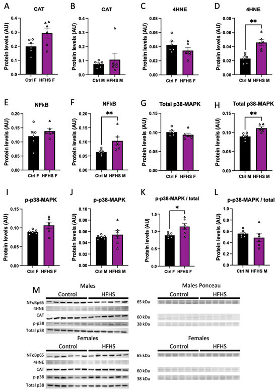Placental labyrinth zone protein levels. Protein levels of catalase (CAT, A,B); 4-Hydroxynonenal (4-HNE, C,D); total levels of p65-NFκB (E,F); total p38 (G,H); phosphorylated p38 (I,J); phosphorylated to total p38 (K,L); and representative image of Western blots (M) from placental labyrinth zone of females (Ctrl F, HFHS F) and males (Ctrl M, HFHS M) are shown. Groups are control (Control, black bars, circles, n = 6) and high-fat high-sugar diet (HFHS, magenta bars, triangles, n = 6). Each dot represents one individual. Mean ± SEM is shown. The ROUT test was applied to identify outliers and Shapiro–Wilk was used to determine the normality of data. Data were submitted to the Student’s t-test or Mann–Whitney according to data distribution. * p ≤ 0.05; ** p < 0.005 vs. control.