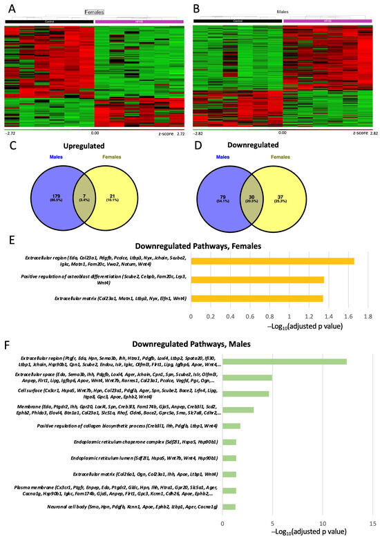 Analysis of the effect of a maternal HFHS diet for each fetal sex separately identified 95 DEGs for females and 295 DEGs for males (are shown in Figure 5A–D). This revealed only 7 genes consistently upregulated (Prlr, Chil3 and Pla2g4a) and 30 genes consistently downregulated (Pdgfb, Ager and Eda) by an HFHS diet in both sexes (Supplementary Tables S2 and S3). The remaining genes were specifically upregulated or downregulated in females (e.g., Cebpb, Slc2a8 and Slc9b1) and males (e.g., Apoe, Lipg, and Oas1b). The DEGs downregulated in the Lz by a maternal HFHS diet in both sexes have proposed roles in osteoblast differentiation, the extracellular space, and the extracellular region (Figure 5E,F) Additional pathways were identified for the downregulated DEGs in the males; these were related to collagen biosynthesis, cell surface, and endoplasmic reticulum chaperone complex (Figure 5E,F). No pathway was significantly over-represented when analyzing the DEGs upregulated by a maternal HFHS diet in the sex-specific comparisons.