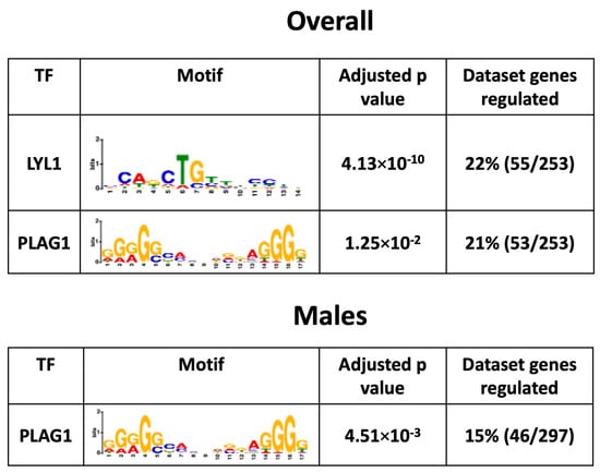 To investigate the mechanisms by which a maternal HFHS diet induces changes in the placental Lz transcriptome, bioinformatic analysis was conducted to search for the significant enrichment of binding sites for transcription factors in the promoter regions of DEGs. This revealed that transcription factors LYL1 and PLAG1 were potentially key factors driving the differential expression of genes in the overall comparison (55/253 = ~22% and 53/253 = ~21%) and that PLAG1 was a key factor for the DEGs in the male-specific comparison (46/297 = 15%) in response to a maternal HFHS diet (no significant enrichment of binding for 113 transcription factors tested at the promoters of the DEGs in females; Figure 6). The mRNA expression of genes encoding LYL1 and PLAG1 was not altered in the placental Lz by a maternal HFHS diet. These data highlight that a maternal HFHS diet may alter the placental transcriptome through modulating the activity of the transcription factors LYL1 and PLAG1.