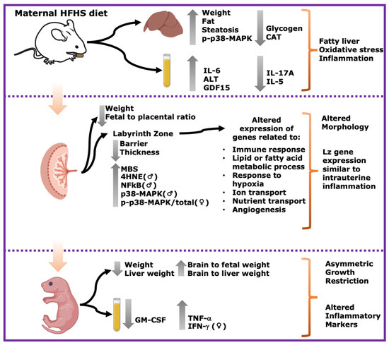 In summary, this study shows that a pregestational obesogenic diet causes hepatic steatosis, oxidative stress, and activation of pro-inflammatory pathways along with imbalanced circulating cytokine concentrations in the mother during pregnancy. Furthermore, fetuses were asymmetrically growth-restricted, showing sex-specific changes in circulating cytokines and alterations in the expression of genes and proteins implicated in oxidative stress, inflammation, and stress signaling (Figure 7). These data are important, given the rising rates of obesity worldwide, and the established link between exposure to adverse gestational environments/abnormal birthweight and the subsequent increased risk of the offspring to develop non-communicable diseases.