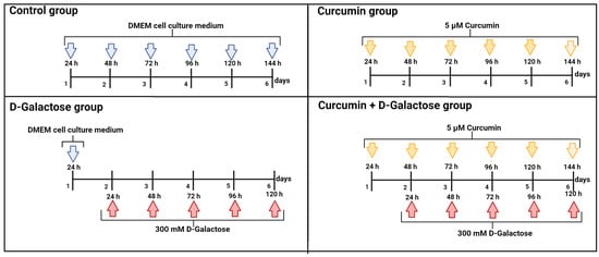 - Curcumin + D-galactose: 24 h before D-galactose exposure, cells were treated with 5 µM curcumin and subsequently simultaneously treated with 5 µM curcumin + 300 mM D-galactose for 120 h. The cell culture medium was changed every 24 h in all experimental groups.