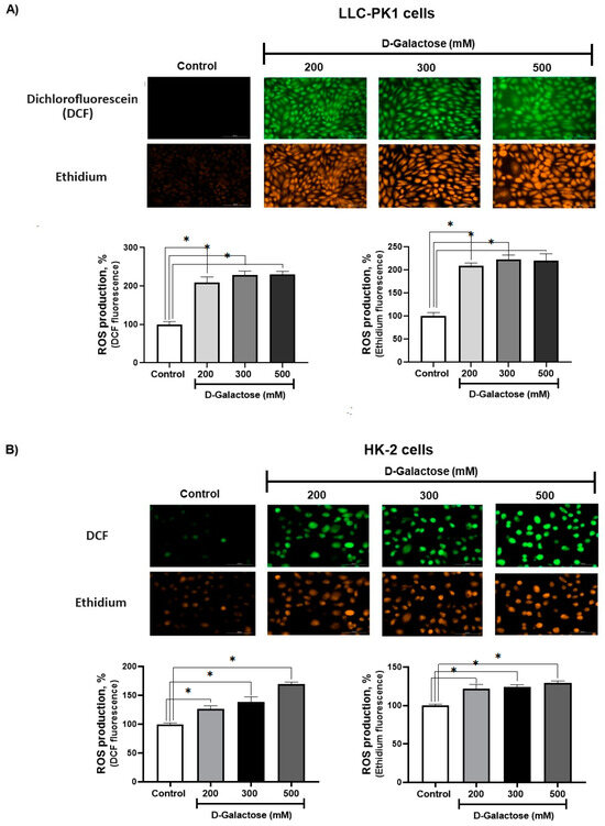 D-galactose induces reactive oxygen production (ROS) production in (A) LLC-PK1 and (B) HK-2 cells after 24 h of treatment. Data are shown as mean ± SEM, n = 3. * p < 0.05 vs. control. DCF = dichlorofluorescein. Objective: 20×, scale bar: 100 μM.