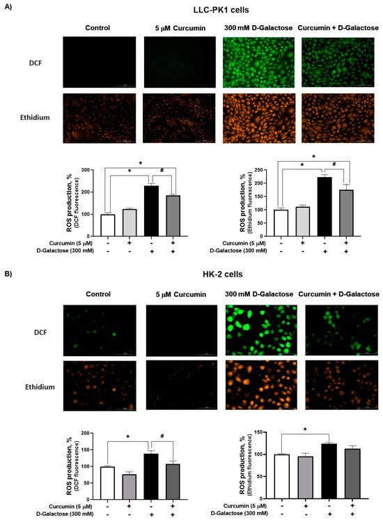 Curcumin decreases reactive oxygen production (ROS) production induced by 24 h exposure to D-galactose in (A) LLC-PK1 and (B) HK-2 cells. Data are shown as mean ± SEM, n = 3. * p < 0.05 vs. control (without curcumin and D-galactose), # p < 0.05 vs. D-galactose. DCF = dichlorofluorescein. Objective: 20×, scale bar: 100 μM.
