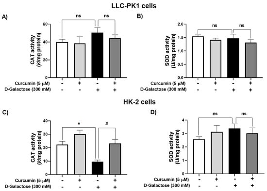 Activity of antioxidant enzymes in LLC-PK1 and HK-2 cells treated for 120 h with 300 mM D-galactose and treated with curcumin. (A) Catalase (CAT) and (B) superoxide dismutase (SOD) activities in LLC-PK1 cells. (C) CAT and (D) SOD activities in HK-2 cells. Data are shown as mean ± SEM, n = 3. * p < 0.05 vs. control (without curcumin and D-galactose), # p < 0.05 vs. D-galactose, ns: not significant.