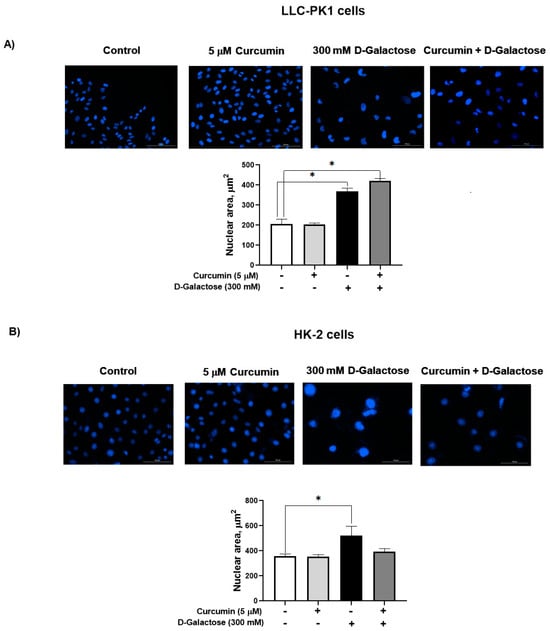 D-galactose exposure for 120 h increases nuclear area both in (A) LLC-PK1 and (B) HK-2 cells. Curcumin had no effect on the increase in nuclear size induced by D-galactose. Data are shown as mean ± SEM, n = 3. * p < 0.05 vs. control (without curcumin and D-galactose). Objective: 20×, scale bar: 100 μM.