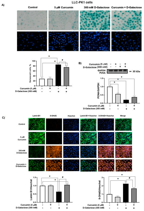 Curcumin prevents senescence induced by 120 h D-galactose exposure in LLC-PK1 cells. (A) Senescence-associated (SA)-β-galactosidase activity. (B) Proliferating cell nuclear antigen (PCNA) expression. (C) Lamin B1 and 8-hydroxy-2′-deoxyguanosine (8-OHdG levels). Data are shown as mean ± SEM, n = 3. * p < 0.05 vs. control (without curcumin and D-galactose), # p < 0.05 vs. D-galactose. GAPDH = glyceraldehyde 3-phosphate dehydrogenase. Objective: 20×, scale bar: 100 μM.