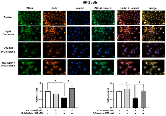 Curcumin prevents the loss of proliferating cell nuclear antigen (PCNA) and Klotho proteins induced by 120 h D-galactose treatment in HK-2 cells. Data are shown as mean ± SEM, n = 3. * p < 0.05 vs. control (without curcumin and D-galactose), # p < 0.05 vs. D-galactose. Objective: 20×, scale bar: 100 μM.