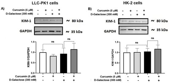 Kidney injury molecule-1 (KIM-1) expression in (A) LLC-PK1 and (B) HK-2 cells treated with D-galactose and curcumin. Data are shown as mean ± SEM, n = 3. ns: not significant.
