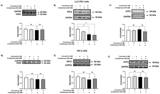 Curcumin effect on mitochondrial and ER stress-related proteins in LLC-PK1 and HK-2 cells exposed for 120 h to D-galactose. Qualitative and quantitative data of expression of (A) voltage-dependent anion channel (VDAC), (B) mitofusin 2 (Mfn2), and (C) ATF4 proteins in LLC-PK1 cells. The same type of data for expression of VDAC, Mfn2, and activating transcription factor 4 (ATF4) in HK-2 cells are shown in panels (D–F), respectively. Bars represent the average of 3 independent experiments ± SEM. * p < 0.05 vs. Control (without D-galactose and curcumin), ns: not significant.