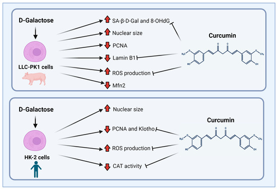 LLC-PK1 and HK-2 cells were obtained from the American Type Culture Collection (ATCC, Rockville, MD, USA). Bovine serum albumin (BSA), ethylenediaminetetraacetic acid (EDTA), citric acid, nitroblue tetrazolium (NBT), Nonidet p-40 (NP-40), D-galactose (cat. G5388), magnesium chloride, protease inhibitors, dihydroethidium (DHE), sodium deoxycholate, sodium dodecyl sulfate (SDS), ammonium molybdate, dimethyl sulfoxide, sodium fluoride, sodium pyrophosphate, sodium orthovanadate, trypan blue, Triton X-100, Tween 20, and the antibody against voltage-dependent anion channel (VDAC, cat. 065M4753V) were acquired from Sigma-Aldrich Co. (St. Louis, MO, USA). Curcumin of a high purity (≥98%, ALX-350-028-M050) was obtained from Enzo Life Sciences, Inc. (Ann Arbor, MI, USA). Dipotassium phosphate, ethylenediaminetetraacetic acid salt, potassium chloride, potassium biphosphate, sodium chloride, sodium bicarbonate, potassium ferrocyanide, and dibasic sodium phosphate were acquired from J.T. Baker (Ciudad de México, Edo. Mex, Mexico). Bradford’s reagent was acquired from Bio-Rad (Hercules, CA, USA), the X-Gal (cat. X4281C) was acquired from GoldBio Gold Biotechnology® (St. Louis, MO, USA), and bisbenzimide H-33342 trihydrochloride (Hoechst) was acquired from FlukaTM Chemicals (Buchs, Switzerland). Dulbecco’s Modified Eagle’s Medium high glucose (DMEM), fetal bovine serum (FBS), and penicillin/streptomycin were from Biowest (Riverside, MO, USA). The TrypLE Express solution was acquired from Thermo Fisher Scientific (Waltham, MA, USA). 2′,7′-Dichlorofluorescin diacetate (DCFH-DA) was from Molecular Probes (Eugene, OR, USA). Antibodies against glyceraldehyde 3-phosphate dehydrogenase (GAPDH, cat. AB9485), 8-hydroxy-2′-deoxyguanosine (8-OHdG, cat. AB6262), and proliferating cell nuclear antigen (PCNA, cat. AB2426) were acquired from Abcam (Boston, MA, USA). The antibody against mitofusin 2 (Mfn2, cat. 9482) was purchased from Cell Signaling Technology (Danvers, MA, USA). The antibody against kidney injury molecule-1 (KIM-1, cat. AF3689) was acquired from R&D Systems (Minneapolis, MN, USA). The antibodies against activating transcription factor 4 (ATF4, cat. SC-200), Klotho (cat. SC515940), and lamin B1 (cat. SC20682) were purchased from Santa Cruz Biotechnology Inc. (Dallas, TX, USA). Alexa Fluor® 488 and Alexa Fluor® 594 secondary antibodies were purchased from Jackson ImmunoResearch Inc. (West Grove, PA, USA). Anti-rabbit IRDye® 800CW (cat. 926-32213) and anti-mouse IRDye® 680RD (cat. 926-68072) secondary antibodies were from LI-COR Biosciences (Lincoln, NE, USA). All the other chemicals and reagents used were of analytical grade and were commercially available.
