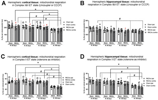 It is noteworthy that differences between Sham and fMCAo groups remained evident at 60 days, 90 days, and 120 days post-ischemic stroke/surgery. Comparing Sham and fMCAo ipsilateral hemisphere cortical tissues at each time point after surgery, day 120 mitochondrial oxygen consumption was significantly different during CI&II OXPHOS (@ p = 0.0125; Figure 1C) and CI&II ET (@ p = 0.0041; Figure 2A). Significant differences between Sham and fMCAo contralateral hemispheres were also observed on day 120 during CI&II OXPHOS ($ p = 0.0465; Figure 1C) and CI&II ET ($ p = 0.0465; Figure 2A). Within hippocampal tissues, no statistically significant differences between Sham and fMCAo groups were observed.