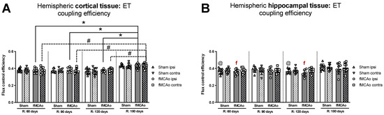 After measuring ET coupling efficiency in hippocampal tissues, no significant differences in flux control efficiency over time were observed in either hemisphere for both fMCAo and Sham groups (Figure 3B).