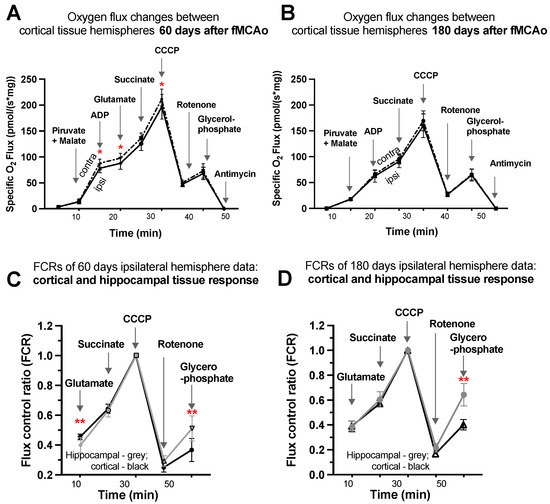 Graphical representations of background-corrected (specific) oxygen flux changes between cortical tissue hemispheres of fMCAo group mice (A) 60 days and (B) 180 days following reperfusion and standardized flux control ratio (FCRs), normalized for maximum flux, of cortical and hippocampal tissue (C) 60 days and (D) 180 days after reperfusion, where solid black lines indicate cortical ipsilateral oxygen flux (A,B) or cortical FCRs (C,D), dotted lines indicate cortical contralateral oxygen flux (A,B), and gray lines indicate hippocampal ipsilateral FCRs (C,D). Analyzed by unpaired t-test, significant changes are denoted by * p < 0.05 vs. fMCAo ipsi cortical tissue and ** p < 0.05 vs. fMCAo ipsi hippocampal tissue. Sample size of cortical tissue measurements: Sham 60 days: n = 10, fMCAo R: 60 days: n = 12, Sham 180 days: n = 9; fMCAo R: 180 days: n = 10. Sample size of hippocampal tissue measurements: Sham 60 days: n = 10, Sham 180 days: n = 10; fMCAo R: 60 days: n = 12, fMCAo R: 180 days: n = 9.