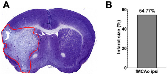 Infarct volume assessment is illustrated by (A) a representative photograph of a Nissl-stained coronal brain section (the red line states the perimeter of the ischemic zone) in a 60 min long fMCAo mouse model (2× microscope’s magnification) and (B) the graph illustrates the infarct area of the ischemic hemisphere expressed in infarct area percentage of whole hemisphere area.