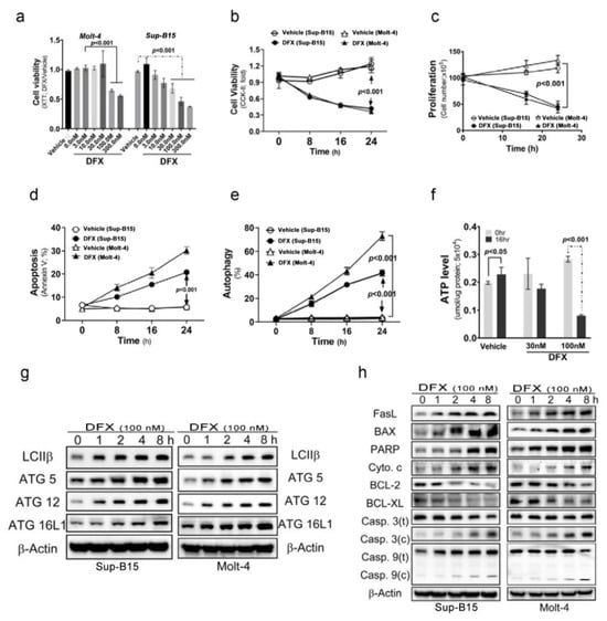 To investigate the cytotoxic effects of DFX on ALL cells, Sup-B15 and Molt-4 cells were treated with varying concentrations of DFX. The results, shown in Figure 1a, reveal a significant decrease in cell viability detected using Cell Counting Kit-8 (CCK-8) when DFX was administered at concentrations of 100 and 300 nM. Thereafter, a fixed concentration of 100 nM DFX was administered and the incubation time varied. The findings, displayed in Figure 1b–e, demonstrate that DFX not only reduced cell viability and proliferation but also stimulated two kinds of programmed cell death (apoptosis and autophagy) in leukaemia cells. The cytotoxic effects of DFX became more pronounced in a time-dependent manner. Notably, a higher percentage of DFX-induced autophagic cells was observed than that of apoptotic cells in both cell types. DFX-induced apoptotic and autophagic activities were further monitored using the levels of several programmed cell death markers. DFX administration significantly increased apoptotic and autophagic marker expression in both ALL cell types (Figure 1g,h and Figure S1a,b). Further, DFX-treated Sup-B15 cells displayed a significantly decreased adenosine triphosphate level than vehicle cells (Figure 1f).