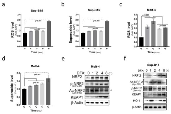 DFX increases intracellular reactive oxygen species (ROS) production and nuclear factor erythroid 2-related factor 2 (NRF2) expression in ALL cells. (a) Intracellular ROS levels were measured as fold increases in fluorescence relative to the negative control after 0, 1, 2, 4, and 8 h exposures of Sup-B15 cells to DFX treatment. (b) The fold change of superoxide levels was assessed after 0, 1, 2, 4, and 8 h exposures of Sup-B15 cells to DFX treatment. (c) Intracellular ROS levels were measured as fold increases in fluorescence relative to the negative control after 0, 1, 2, 4, and 8 h exposures of Molt-4 cells to DFX treatment. (d) The fold change of superoxide levels was assessed after 0, 1, 2, 4, and 8 h exposures of Molt-4 cells to DFX treatment. (e) Western blotting was conducted to assess the levels of NRF2, p-NRF2, Ac-NRF2, KEAP1, and HO-1 in lysates of Molt-4 cells after DFX treatment. (f) Western blotting was conducted to assess the levels of NRF2, p-NRF2, Ac-NRF2, KEAP1, and HO-1 in lysates of Sup-B15 cells after DFX treatment.